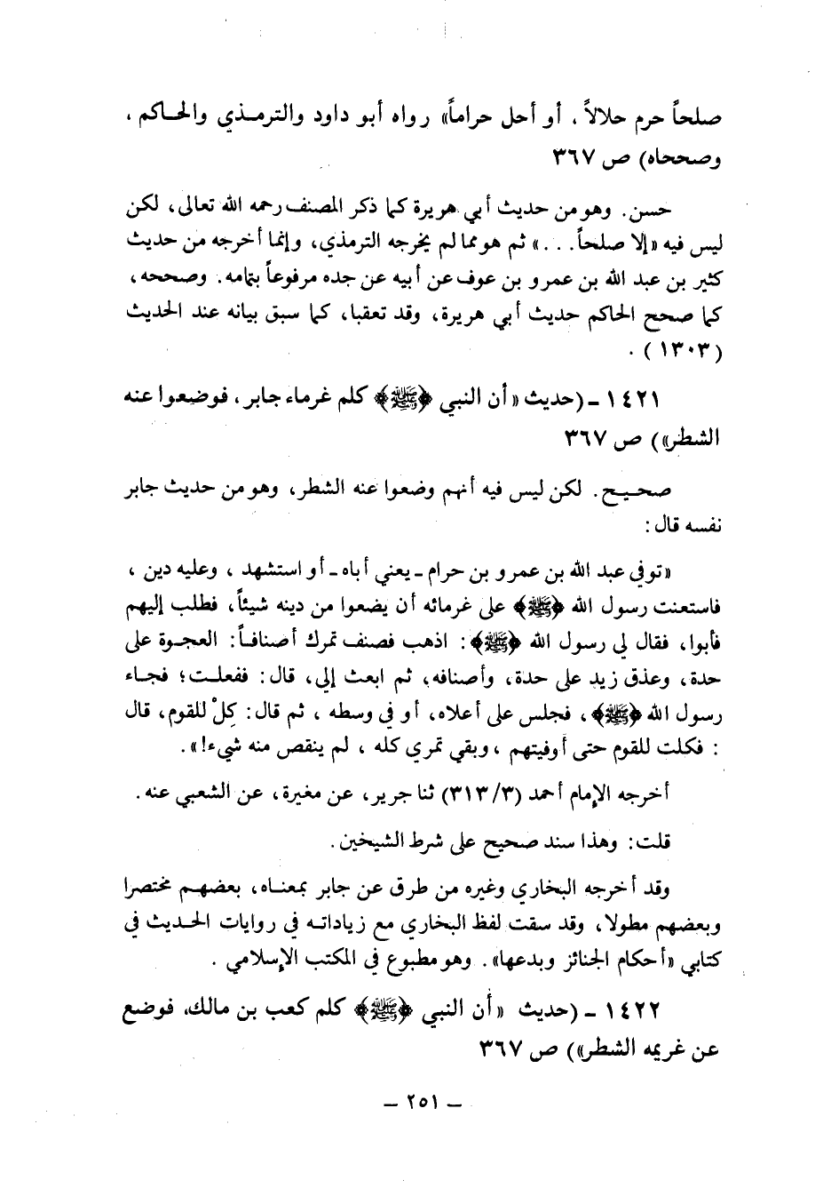 (1421) - (حديث: " أن النبى صلى الله عليه وسلم كلم غرماء جابر , فوضعوا عنه الشطر " (ص 367) .