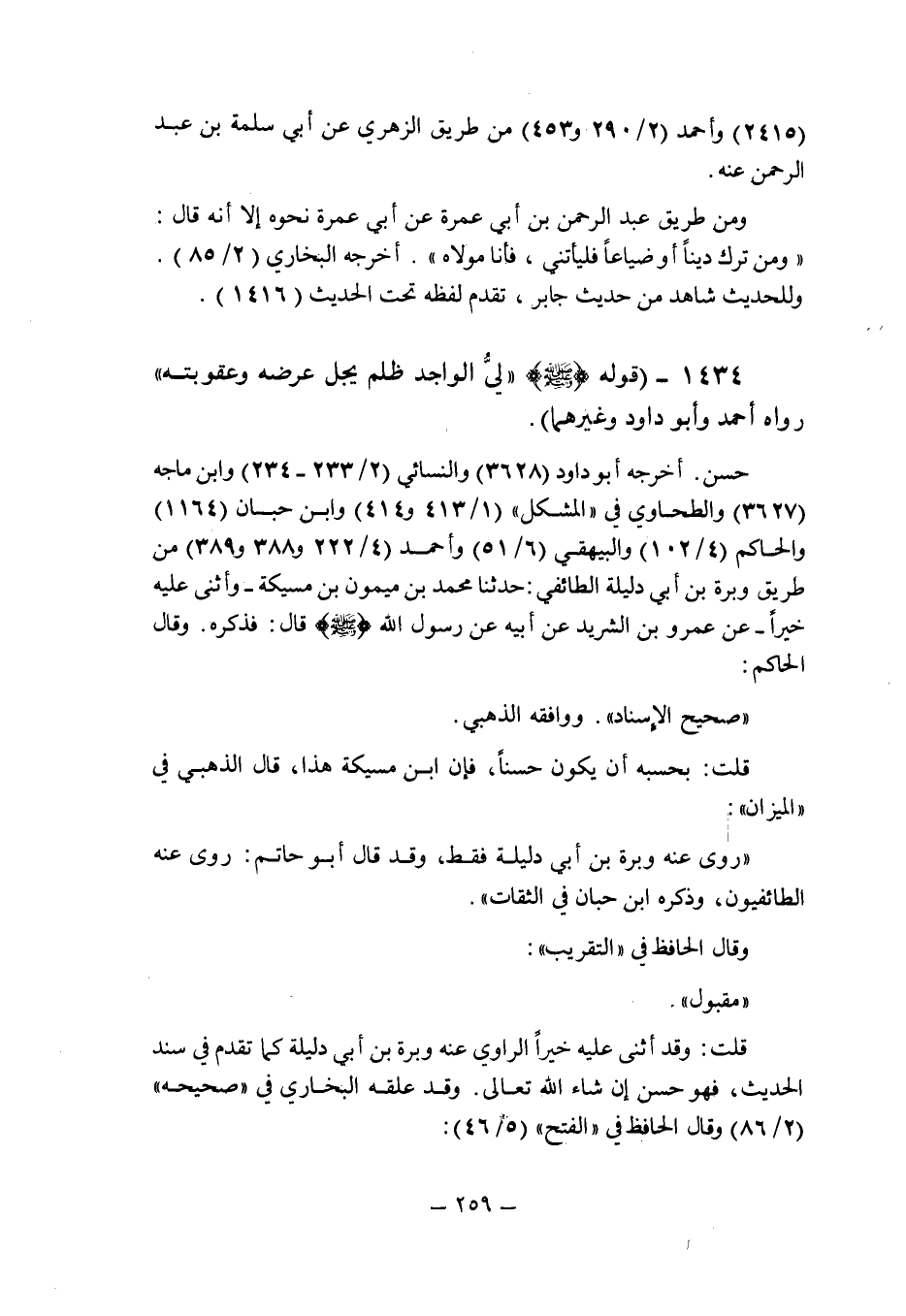 (1434) - (قوله صلى الله عليه وسلم: " لى الواجد ظلم (يجل) [1] عرضه وعقوبته " رواه أحمد وأبو داود وغيرهما.