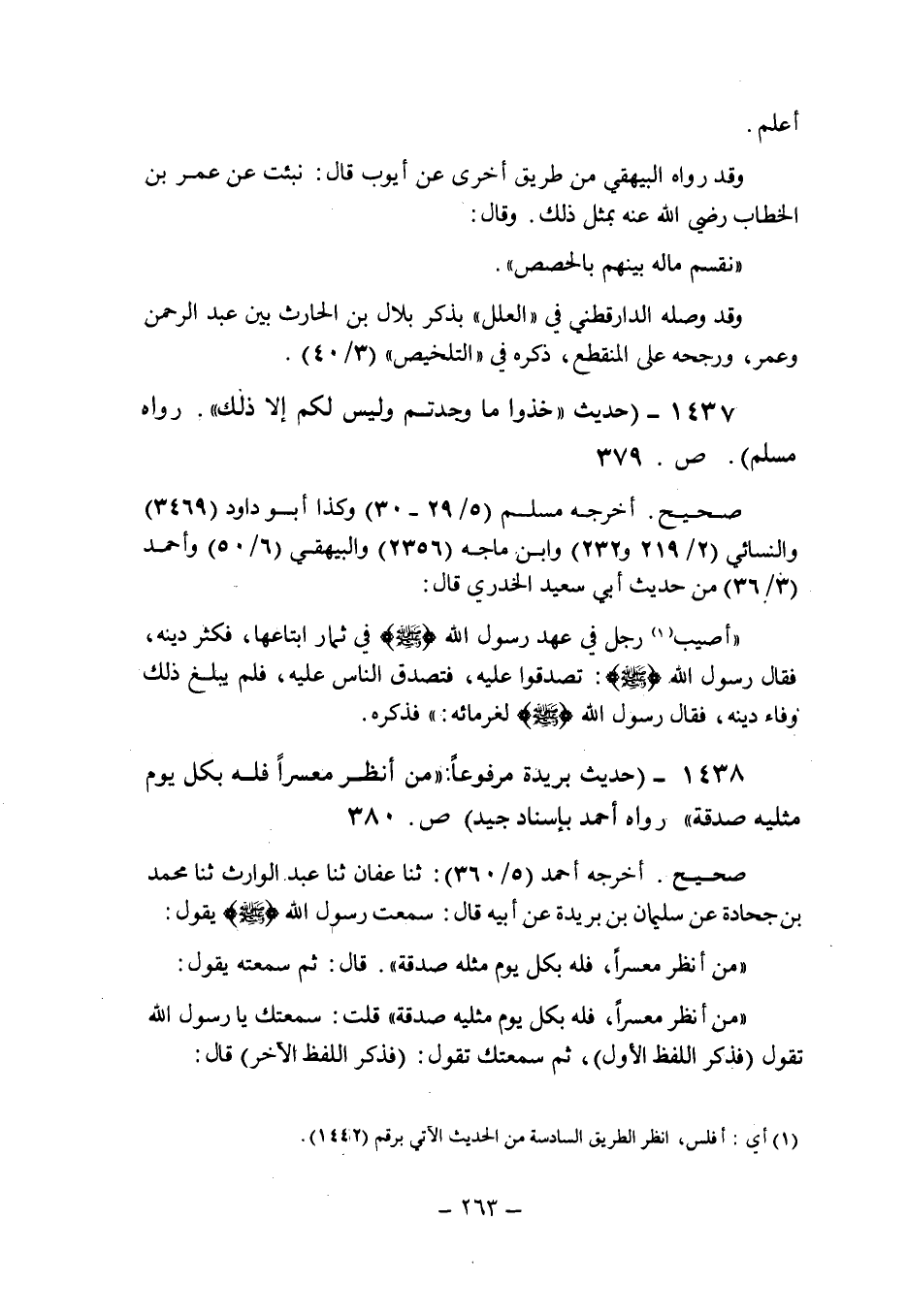 أخرجه مسلم (5/29 ـ 30) وكذا أبو داود (3469) والنسائى (2/219 , 232) وابن ماجه (2356) والبيهقى (6/50) وأحمد (3/36) من حديث أبى سعيد الخدرى قال: " أصيب (1) رجل فى عهد رسول الله صلى الله عليه وسلم فى ثمار ابتاعها , فكثر دينه , فقال رسول الله صلى الله عليه وسلم: تصدقوا عليه , فتصدق الناس عليه , فلم يبلغ ذلك وفاء دينه , فقال رسول الله صلى الله عليه وسلم لغرمائه: " فذكره