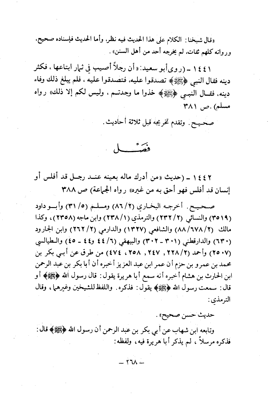 (1442) - (حديث: " من أدرك ماله بعينه عند رجل قد أفلس أو إنسان قد أفلس فهو أحق به من غيره " رواه الجماعة (ص 388) .