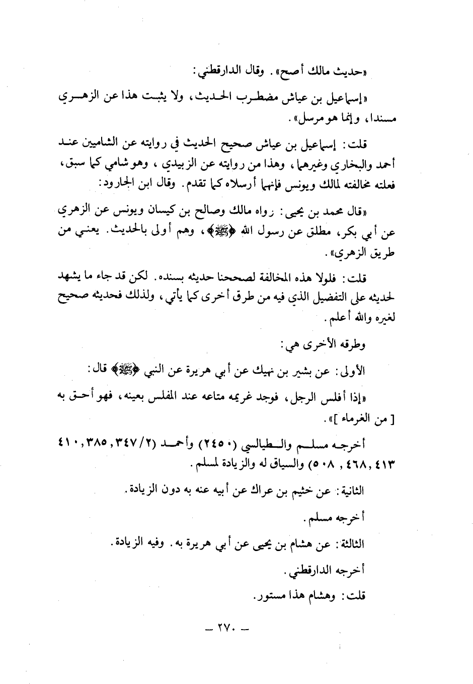 قلت: إسماعيل بن عياش صحيح الحديث فى روايته عن الشاميين عند أحمد والبخارى وغيرهما , وهذا من روايته عن الزبيدى , وهو شامى كما سبق , فعلته مخالفته لمالك ويونس فإنهما أرسلاه كما تقدم.