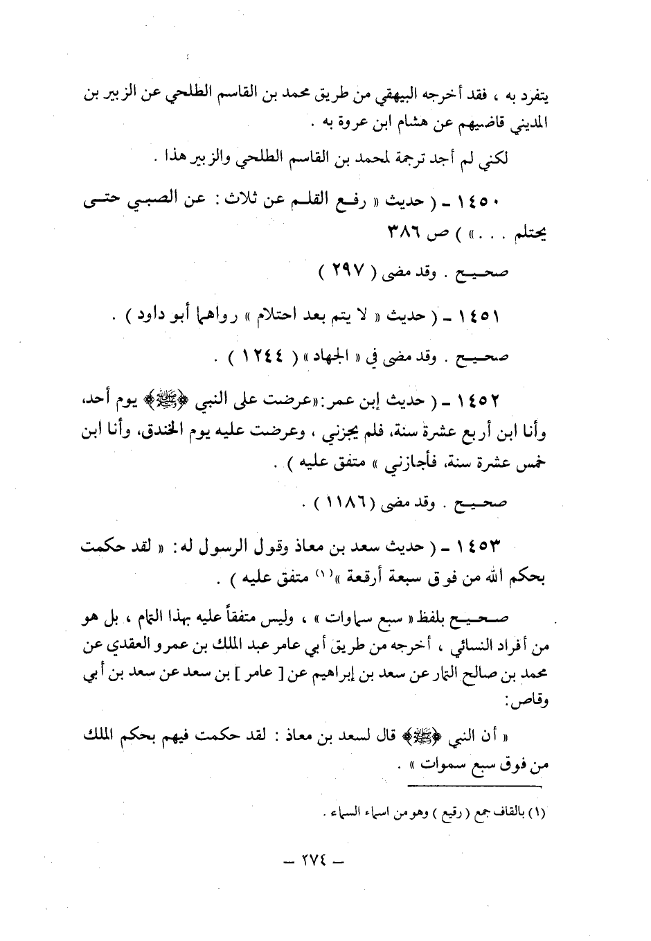 (1450) - (حديث: " رفع القلم عن ثلاث: عن الصبى حتى يحتلم ... " (ص 386) .