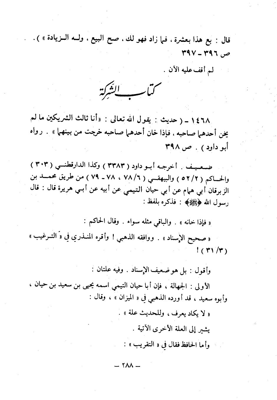 (1468) - (حديث: " يقول الله تعالى: أنا ثالث الشريكين ما لم يخن أحدهما صاحبه , فإذا خان أحدهما صاحبه خرجت من بينهما " رواه أبو داود (398) .