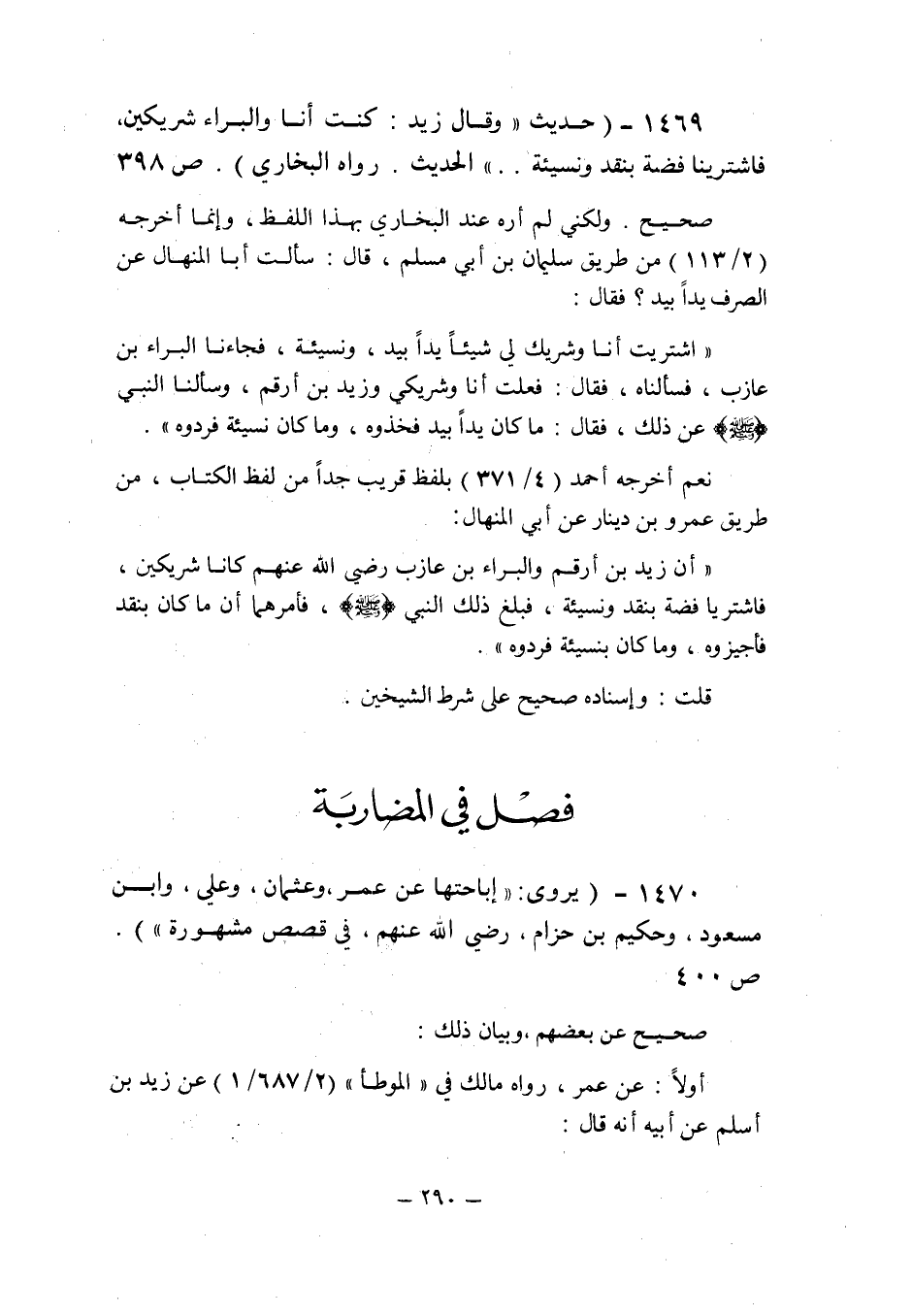 (1469) - (حديث: " وقال زيد: كنت أنا والبراء شريكين , فاشترينا فضة بنقد ونسيئة.. " الحديث رواه البخارى (ص 398) .