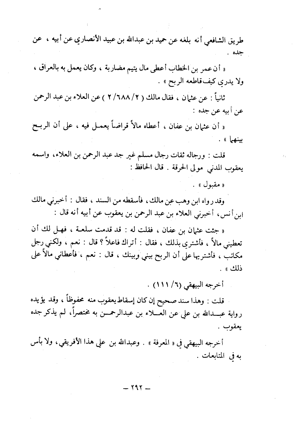 وقد رواه ابن وهب عن مالك , فأسقطه من السند , فقال: أخبرنى مالك بن أنس , أخبرنى العلاء بن عبد الرحمن بن يعقوب عن أبيه أنه قال: " جئت عثمان بن عفان , فقلت له: قد قدمت سلعة , فهل لك أن تعطينى مالا , فأشترى بذلك , فقال: أتراك فاعلا؟ قال: نعم , ولكنى رجل مكاتب , فأشتريها على أن الربح بينى وبينك , قال: نعم , فأعطانى مالا على ذلك ".