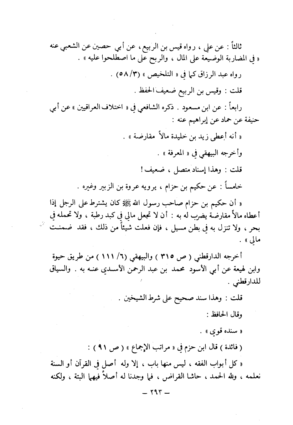 (فائدة) : قال ابن حزم فى " مراتب الإجماع " (ص 91) : " كل أبواب الفقه , ليس منها باب , إلا وله أصل فى القرآن أو السنة نعلمه , ولله الحمد , حاشا القراض , فما وجدنا له أصلا فيهما البتة , ولكنه