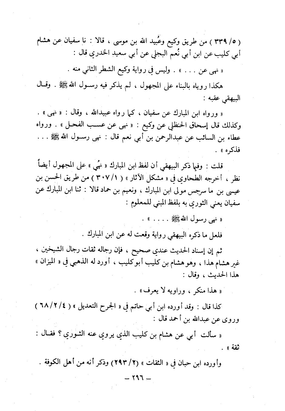 قلت: وفيما ذكر البيهقى أن لفظ ابن المبارك " نهى " على المجهول أيضا نظر , أخرجه الطحاوى فى " مشكل الآثار " (1/307) من طريق الحسن بن عيسى ابن ماسرجس مولى ابن المبارك , ونعيم بن حماد قالا: حدثنا ابن المبارك عن سفيان يعنى الثورى به بلفظ المبنى للمعلوم: " نهى رسول الله صلى الله عليه وسلم....".