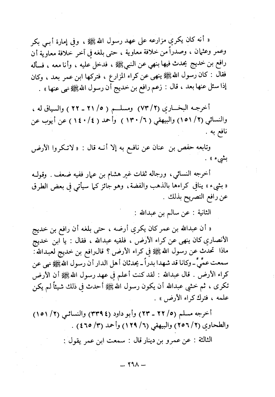 الثانية: عن سالم بن عبد الله: " أن عبد الله بن عمر كان يكرى أرضه , حتى بلغه أن رافع بن خديج الأنصارى كان ينهى عن كراء الأرض , فلقيه عبد الله , فقال: يا ابن خديج ماذا تحدث عن رسول الله صلى الله عليه وسلم فى كراء الأرض؟ قال رافع بن خديج لعبد الله: سمعت عمى ـ وكانا قد شهد بدرا ـ يحدثان أهل الدار أن رسول الله صلى الله عليه وسلم نهى عن كراء الأرض.