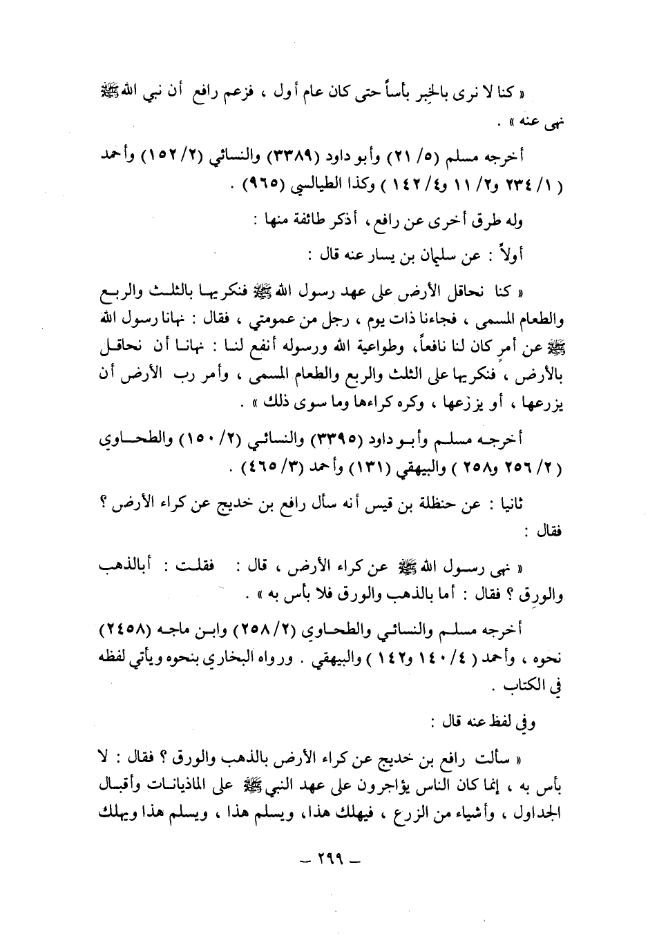 وله طرق أخرى عن رافع , أذكر طائفة منها: أولا: عن سليمان بن يسار عنه قال: " كنا نحاقل الأرض على عهد رسول الله صلى الله عليه وسلم فنكريها بالثلث والربع والطعام المسمى , فجاءنا ذات يوم , رجل من عمومتى , فقال: نهانا رسول الله صلى الله عليه وسلم عن أمر كان لنا نافعا , وطواعية الله ورسوله أنفع لنا , نهانا أن نحاقل بالأرض , فنكريها على الثلث والربع والطعام المسمى , وأمر رب الأرض أن يزرعها أو يزرعها , وكره كراءها وما سوى ذلك ".