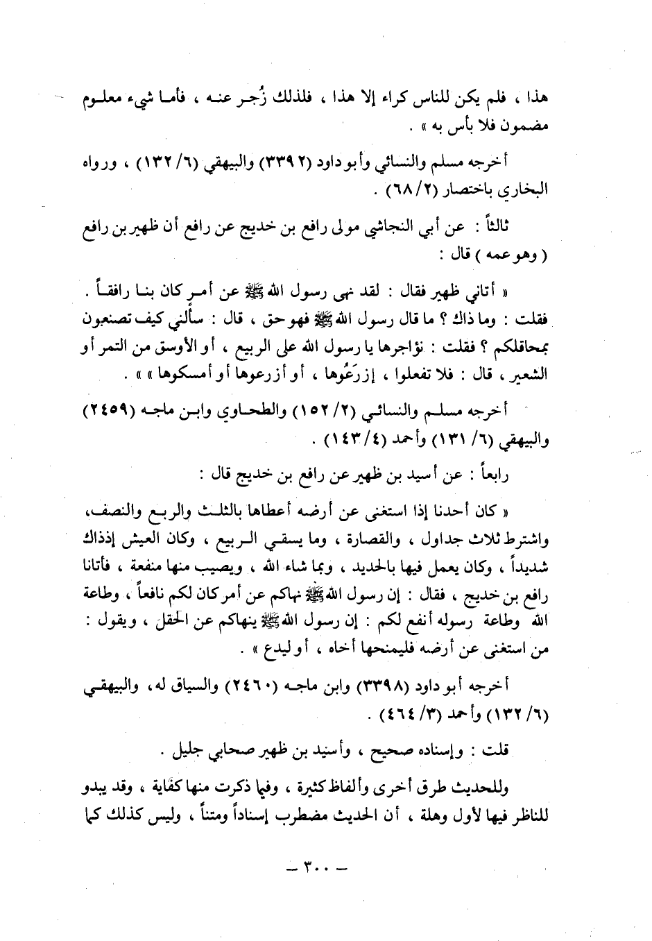 رابعاً: عن أسيد بن ظهير عن رافع بن خديج قال: " كان أحدنا إذا استغنى عن أرضه أعطاها بالثلث والربع والنصف , واشترط ثلاث جداول , والقصارة , وما يسقى الربيع , وكان العيش إذ ذاك شديدا , وكان يعمل فيها بالحديد , وبما شاء الله , ويصيب منها منفعة , فأتانا رافع بن خديج , فقال: إن رسول الله صلى الله عليه وسلم نهاكم عن أمر كان لكم نافعا , وطاعة الله وطاعة رسوله أنفع لكم , إن رسول الله صلى الله عليه وسلم ينهاكم عن الحقل , ويقول: من استغنى عن أرضه فليمنحها أخاه , أو ليدع ".