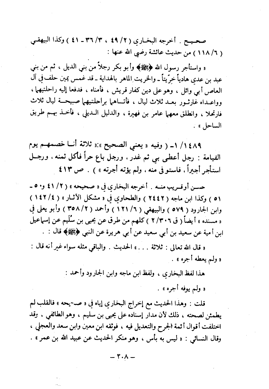 (1489/1) - (وفيه يعني الصحيح: ثلاثة أنا خصمهم يوم القيامة رجل أعطى بي ثم غدر ورجل باع حرا فأكل ثمنه ورجل استأجر أجيرا فاستوفى منه ولم يؤته أجرته) ص 413