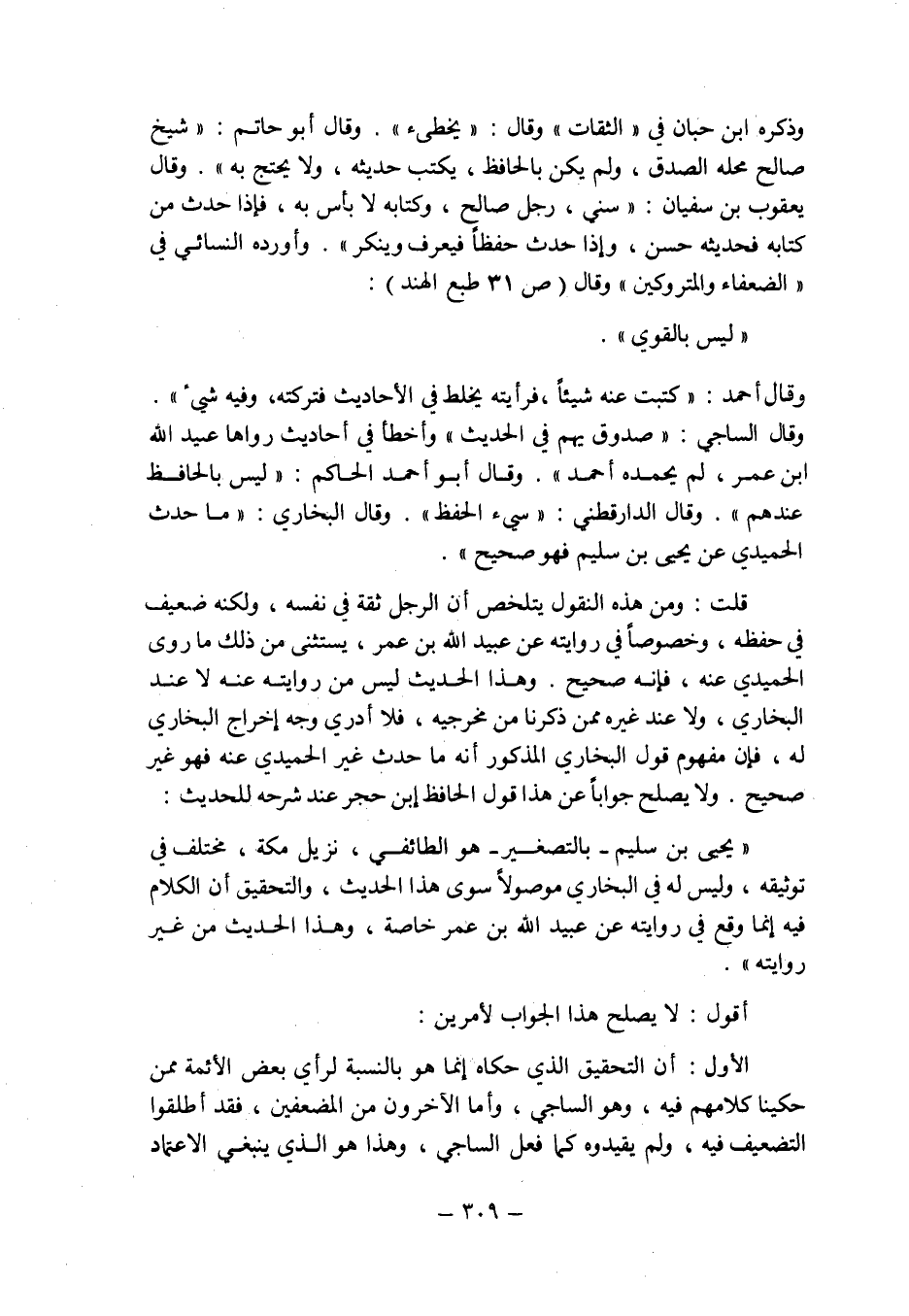 الأول أن التحقيق الذي حكاه إنما هو بالنسبة لرأي بعض الأئمة ممن حكينا كلامهم فيه وهو الساجي وأما الآخرون من المضعفين فقد أطلقوا التضعيف فيه ولم يقيدوه كما فعل الساجي وهذا هو الذي ينبغي الاعتماد