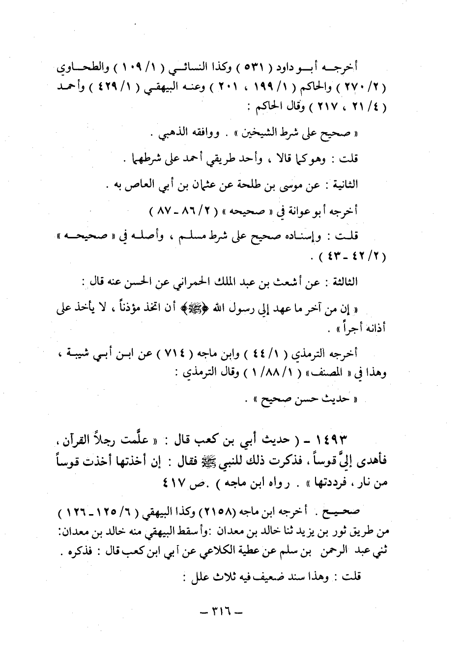 (1493) - (حديث أبى بن كعب قال: " علمت رجلا القرآن , فأهدى إلى قوسا , فذكرت ذلك للنبى صلى الله عليه وسلم فقال: إن أخذتها أخذت قوسا من نار , فرددتها ". رواه ابن ماجه (ص 417) .