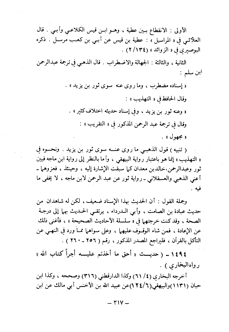 ونحوه فى " التهذيب " إنما هو باعتبار رواية البيهقى , وأما بالنظر إلى رواية ابن ماجه فبين ثور وعبد الرحمن , خالد بن معدان كما سبقت الإشارة إليه , وحينئذ , فعزوهما ـ أعنى الذهبى والعسقلانى ـ رواية ثور عن عبد الرحمن لابن ماجه , لا يخفى ما فيه.