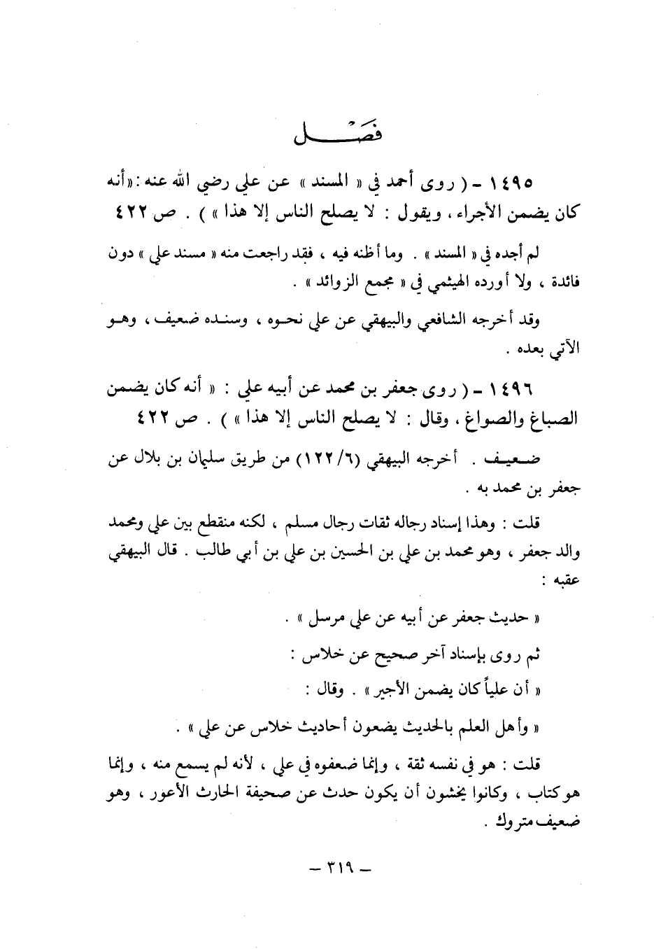 (1495) - (روى أحمد فى " المسند " عن على رضى الله عنه: " أنه كان يضمن الأجراء , ويقول: لا يصلح الناس إلا هذا " (ص 422) .