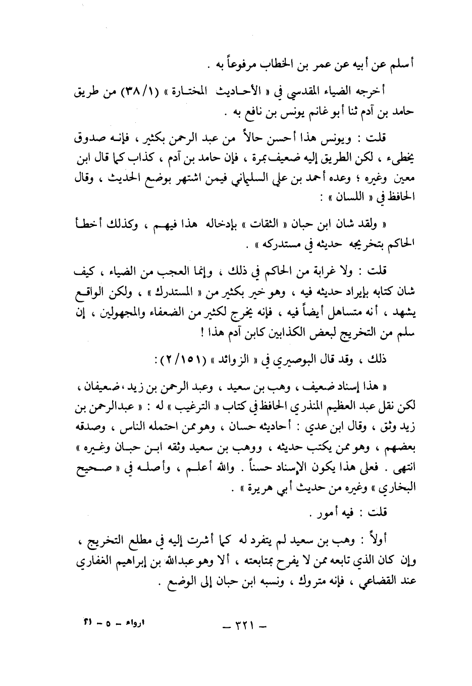 قلت: ولا غرابة من الحاكم فى ذلك , وإنما العجب من الضياء , كيف شان كتابه بإيراد حديثه فيه , وهو خير بكثير من " المستدرك " , ولكن الواقع يشهد , أنه متساهل أيضا فيه , فإنه يخرج الكثير من الضعفاء والمجهولين , إن سلم من التخريج لبعض الكذابين كابن آدم هذا! ذلك , وقد قال البوصيرى فى " الزوائد " (151/2) : " هذا إسناد ضعيف , وهب بن سعيد , وعبد الرحمن بن زيد ضعيفان , لكن نقل عبد العظيم المنذرى الحافظ فى كتاب " الترغيب " له: " عبد الرحمن بن زيد وثق , وقال ابن عدى: أحاديثه حسان , وهو ممن احتمله الناس , وصدقه بعضهم , وهو ممن يكتب حديثه , ووهب بن سعيد وثقه ابن حبان وغيره " انتهى.