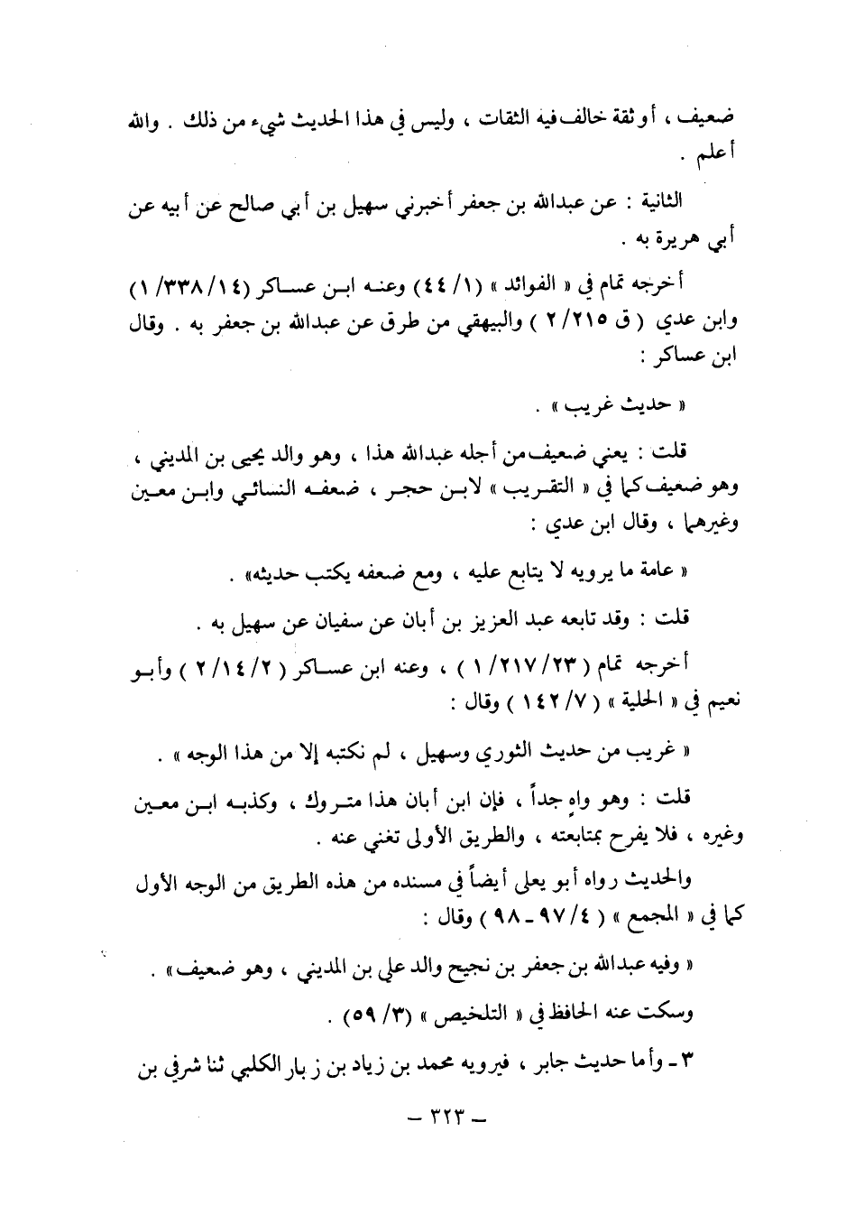 قلت: يعنى ضعيف من (أجله) [1] عبد الله هذا , وهو والد يحيى بن المدينى , وهو ضعيف كما فى " التقريب " لابن حجر , ضعفه النسائى وابن معين وغيرهما , وقال ابن عدى: " عامة ما يرويه لا يتابع عليه , ومع ضعفه يكتب حديثه ".