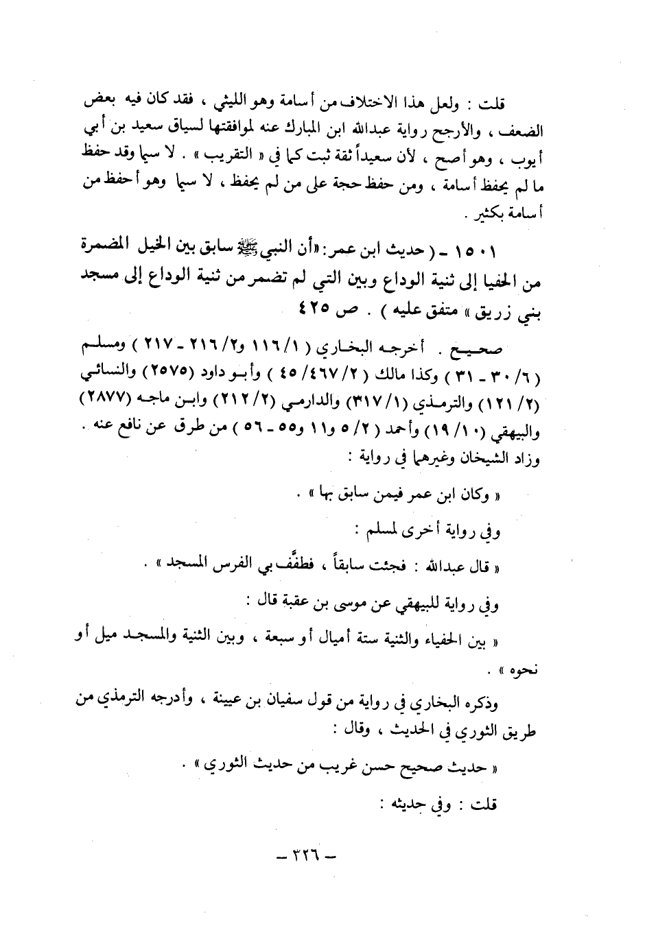 (1501) - (حديث ابن عمر: " أن النبى صلى الله عليه وسلم سابق بين الخيل المضمرة من الحفيا إلى ثنية الوداع وبين التى لم تضمر من ثنية الوداع إلى مسجد بنى زريق " متفق عليه (ص 425) .