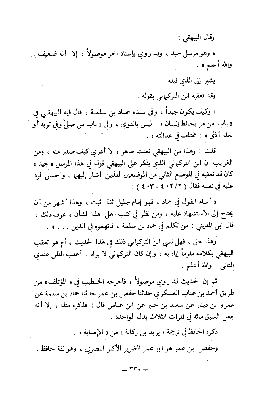 قلت: وهذا من البيهقى تعنت ظاهر , لا أدرى كيف صدر منه , ومن الغريب أن ابن التركمانى الذى ينكر على البيهقى قوله فى هذا المرسل " جيد " كان قد تعقبه فى الموضع الثانى من الموضعين اللذين أشار إليهما , وأحسن الرد عليه فى تعنته فقال (2/402 ـ 403) : " أساء القول فى حماد , فهو إمام جليل ثقة ثبت , وهذا أشهر من أن يحتاج إلى الاستشهاد عليه , ومن نظر فى كتب أهل هذا الشأن , عرف ذلك.