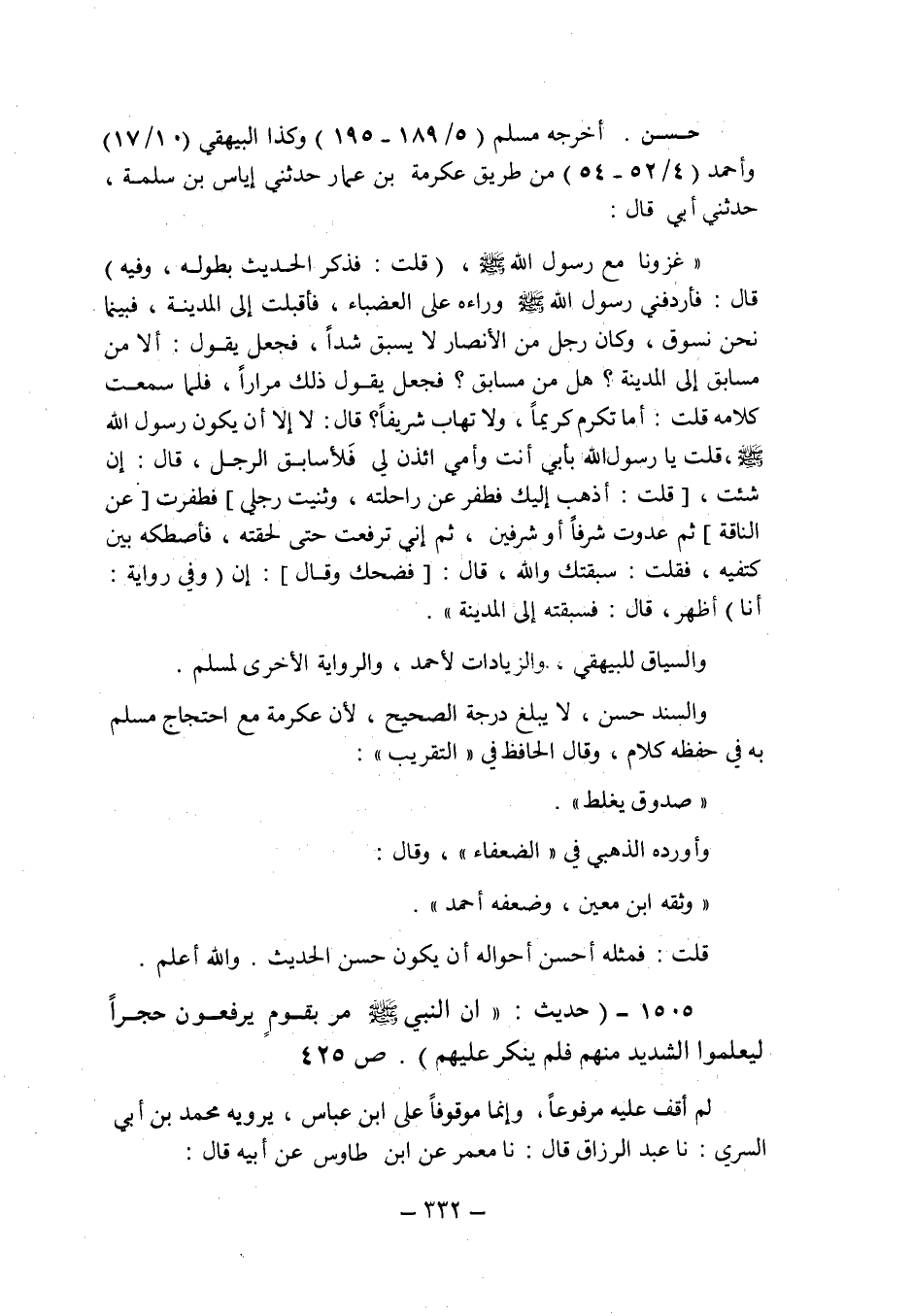 أخرجه مسلم (5/189 ـ 195) وكذا البيهقى (10/17) وأحمد (4/52 ـ 54) من طريق عكرمة بن عمار حدثنى إياس بن سلمة , حدثنى أبى قال: " غزونا مع رسول الله صلى الله عليه وسلم (قلت: فذكر الحديث بطوله , وفيه) قال: فأردفنى رسول الله صلى الله عليه وسلم وراءه على العضباء , فأقبلت إلى المدينة , فبينما نحن نسوق , وكان رجل من الأنصار لا يسبق شدا , فجعل يقول: ألا من مسابقة إلى المدينة؟ هل من مسابق؟ فجعل يقول ذلك مرارا , فلما سمعت كلامه قلت: أما تكرم كريما , ولا تهاب شريفا؟ قال: لا إلا أن يكون رسول الله صلى الله عليه وسلم , قلت يا رسول الله بأبى أنت وأمى ائذن لى فلأسابق الرجل , قال: إن شئت , [قلت: أذهب إليك فطفر عن راحلته , وثنيت رجلى] فطفرت [عن الناقة] ثم عدوت شرفا أو شرفين , ثم إنى ترفعت حتى لحقته , فأصطكه بين كتفيه , فقلت: سبقتك والله , قال: [فضحك وقال] : إن (وفى رواية أنا) (أظهر) [1] , قال: فسبقته إلى المدينة ".