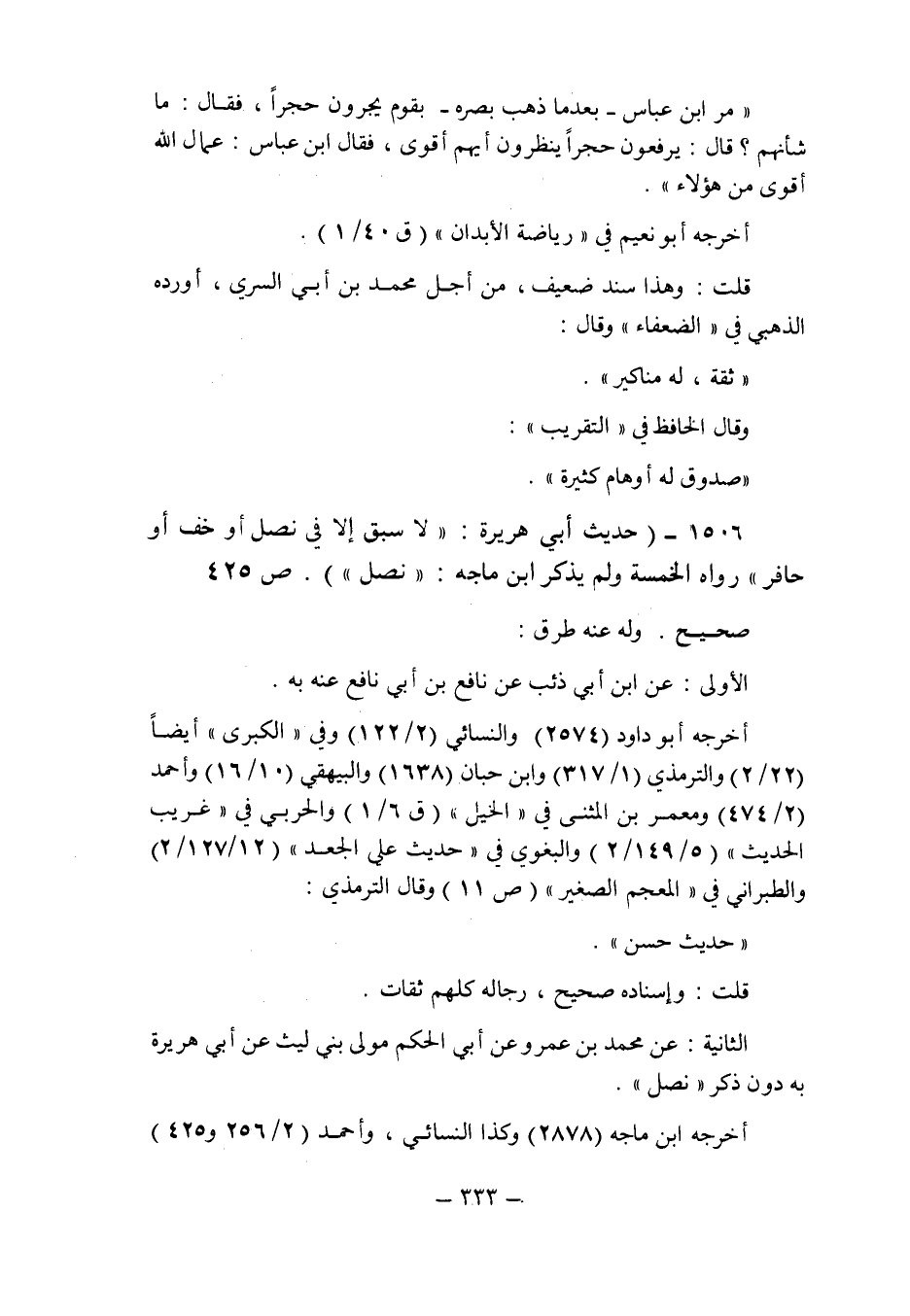 (1506) - (حديث أبى هريرة: " لا سبق إلا فى نصل أو خف أو حافر ". رواه الخمسة ولم يذكر ابن ماجه: " نصل " (ص 425) .