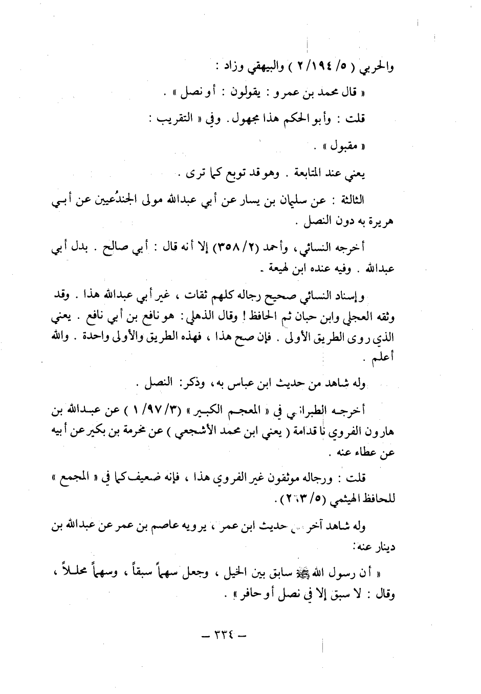وله شاهد آخر من حديث ابن عمر , يرويه عاصم بن عمر عن عبد الله بن دينار عنه: " أن رسول الله صلى الله عليه وسلم سابق بين الخيل , وجعل سهماً سبقاً , وسهما محللا , وقال: لا سبق إلا فى نصل أو حافر ".
