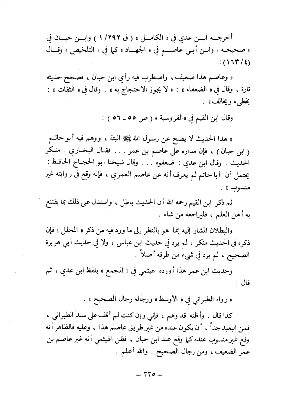 وأظنه قد وهم , فإنى وإن كنت لم أقف على سند الطبرانى , فمن البعيد جدا , أن يكون عنده من غير طريق عاصم هذا , وعليه فالظاهر أنه وقع غير منسوب عنده كما وقع عند ابن حبان , فظن الهيثمى أنه غير عاصم بن عمر الضعيف , ومن رجال الصحيح , والله أعلم. [1]