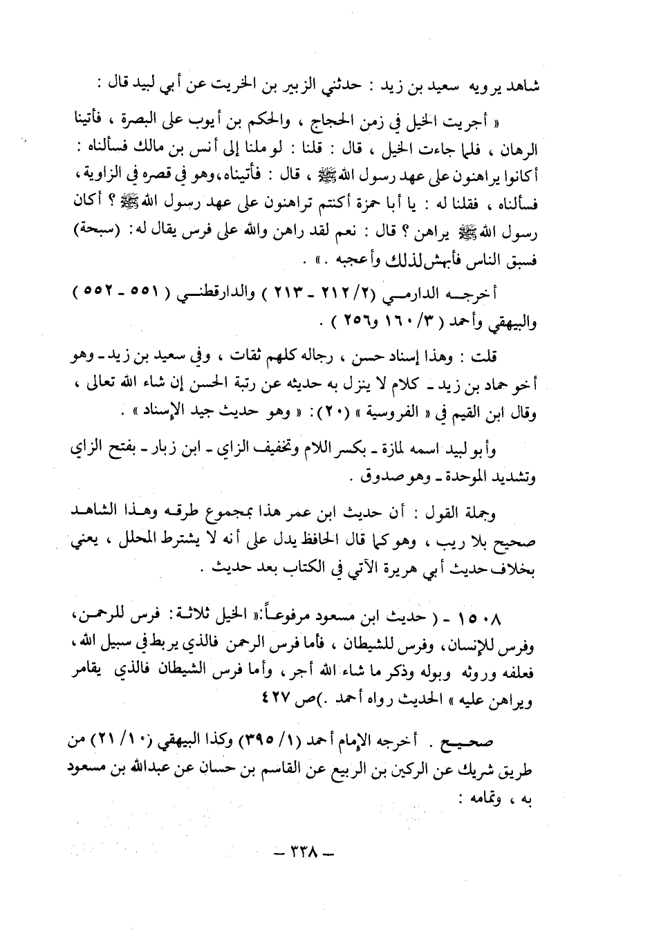 قلت: وهذا إسناد حسن , رجاله كلهم ثقات , وفى سعيد بن زيد ـ وهو أخو حماد بن زيد ـ كلام لا ينزل به حديثه عن رتبة الحسن إن شاء الله تعالى , وقال ابن القيم فى " الفروسية " (20) : " وهو حديث جيد الإسناد ".