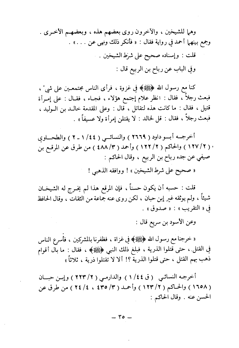 وفى الباب عن رباح بن الربيع قال: " كنا مع رسول الله صلى الله عليه وسلم فى غزوة , فرأى الناس مجتمعين على شىء , فبعث رجلا , فقال: انظر علام اجتمع هؤلاء , فجاء , فقال: على امرأة قتيل , فقال: ما كانت هذه لتقاتل , قال: وعلى المقدمة خالد بن الوليد , فبعث رجلا , فقال: قل لخالد: لا يقتلن امرأة ولا عسيفا ".
