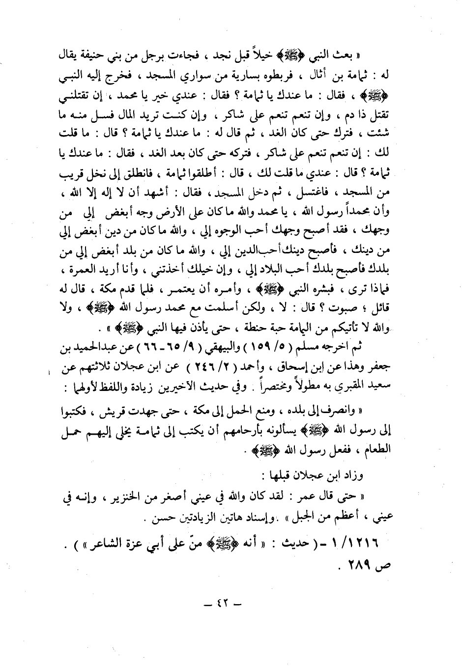 " بعث النبى صلى الله عليه وسلم خيلا قبل نجد , فجاءت برجل من بنى حنيفة يقال له: ثمامة بن أثال , فربطوه بسارية من سوارى المسجد , فخرج إليه النبى صلى الله عليه وسلم , فقال: ما عندك يا ثمامة؟ فقال: عندى خير يا محمد , إن تقتلنى تقل ذا دم , وإن تنعم تنعم على شاكر , وإن كنت تريد المال فسل منه ما شئت , فترك حتى كان الغد , ثم قال له: ما عندك يا ثمامة؟ قال: ما قلت لك , إن تنعم تنعم على شاكر , فتركه حتى كان بعد الغد , فقال: ما عندك يا ثمامة؟ قال: عندى ما قلت لك قال: أطلقوا ثمامة , فانطلق إلى نخل قريب من المسجد , فاغتسل , ثم دخل المسجد , فقال: أشهد أن لا إله إلا الله , وأن محمدا رسول الله , يا محمد والله ما كان على الأرض وجه أبغض إلى من وجهك , فقد أصبح وجهك أحب الوجوه إلى , والله ما كان من دين أبغض إلى من دينك , فأصبح دينك أحب الدين إلى , والله ما كان من بلد أبغض إلى من بلدك فأصبح بلدك أحب البلاد إلى , وإن خيلك أخذتنى , وأنا أريد العمرة , فماذا ترى , فبشره النبى صلى الله عليه وسلم , وأمره أن يعتمر , فلما قدم مكة , قال له قائل ; صبوت؟ قال: لا , ولكن أسلمت مع محمد رسول الله صلى الله عليه وسلم , ولا والله لا تأتيكم من اليمامة حبة حنطة , حتى يأذن فيها النبى صلى الله عليه وسلم ".