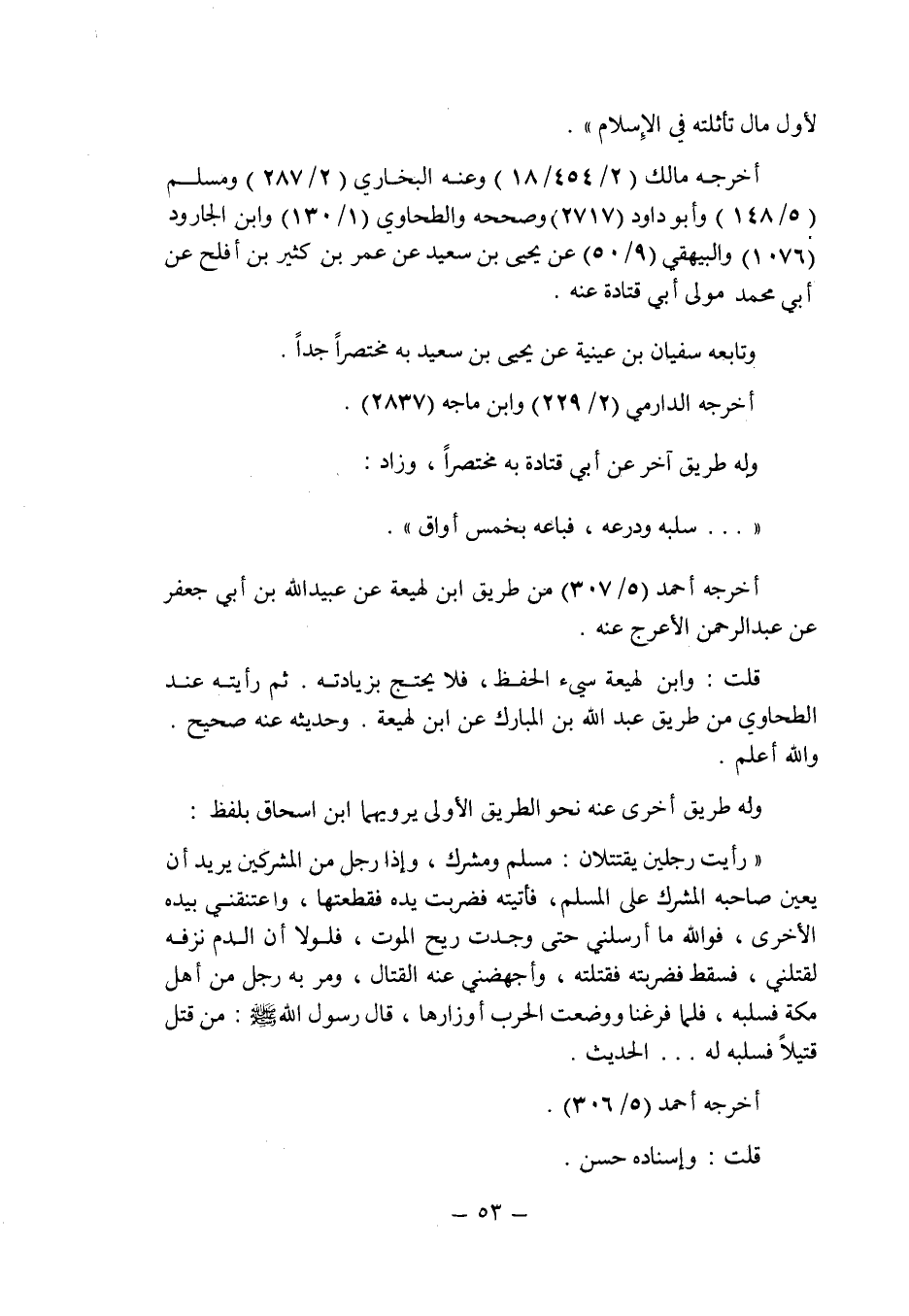 وله طريق أخرى عنه نحو الطريق الأولى يرويها ابن إسحاق بلفظ: " رأيت رجلين يقتتلان: مسلم ومشرك , وإذا رجل من المشركين يريد أن يعين صاحبه المشرك على المسلم , فأتيته فضربت يده فقطعتها , واعتنقنى بيده الأخرى , فوالله ما أرسلنى حتى وجدت ريح الموت , فلولا أن الدم نزفه لقتلنى , فسقط فضربته فقتلته , وأجهضنى عنه القتال , ومر به رجل من أهل مكة فسلبه , فلما فرغنا ووضعت الحرب أوزارها , قال رسول الله صلى الله عليه وسلم: من قتل قتيلا فسلبه له ... الحديث أخرجه أحمد (5/306) .