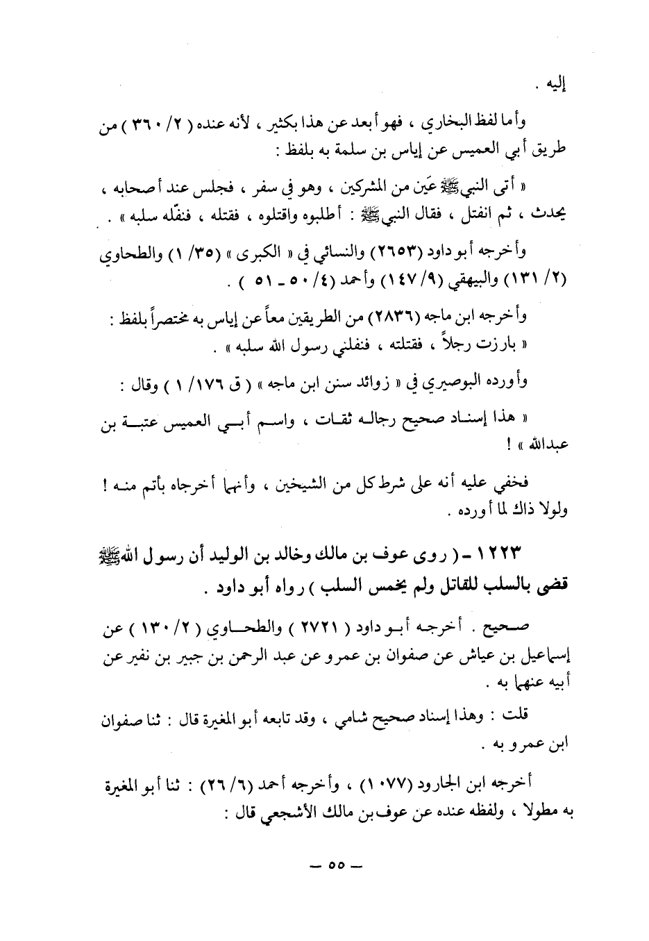 (1223) - (روى عوف بن مالك وخالد بن الوليد: " أن رسول الله صلى الله عليه وسلم قضى بالسلب للقاتل ولم يخمس السلب ".