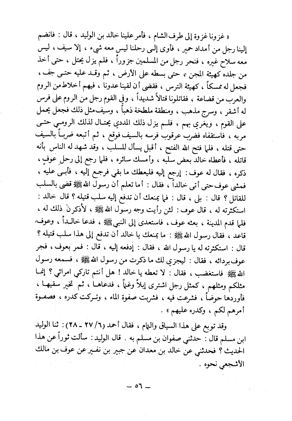 " غزونا غزوة إلى طرف الشام , فأمر علينا خالد بن الوليد , قال: فانضم إلينا رجل من أمداد حمير , فأوى إلى رحلنا ليس معه شىء , إلا سيف , ليس معه سلاح غيره , فنحر رجل من المسلمين جزورا , فلم يزل يحتل , حتى أخذ من جلده كهيئة المجن , حتى بسط على الأرض , ثم وقد عليه حتى جف , فجعل له ممسكا , كهيئة الترس , فقضى أن لقينا عدونا , فيهم أخلاط من الروم والعرب من قضاعة , فقاتلونا قتالا شديدا , وفى القوم رجل من الروم على فرس له أشقر , وسرج مذهب , ومنطقة ملطخة ذهبا , وسيف مثل ذلك فجعل يحمل على القوم , ويغرى بهم , فلم يزل ذلك المددى يحتال لذلك الرومى حتى مر به , فاستقفاه فضرب عرقوب فرسه بالسيف فوقع , ثم أتبعه ضربا بالسيف حتى قتله , فلما فتح الله الفتح , أقبل يسأل للسلب , وقد شهد له الناس بأنه قاتله , فأعطاه خالد بعض سلبه , وأمسك سائره , فلما رجع إلى رحل عوف , ذكره , فقال له عوف: ارجع إليه فليعطك ما بقى فرجع إليه , فأبى عليه , فمشى عوف حتى أتى خالدا , فقال: أما تعلم أن رسول الله صلى الله عليه وسلم قضى بالسلب للقاتل؟ قال: بلى , قال: فما يمنعك أن تدفع إليه سلب قتيله؟ قال خالد: استكثرته له , قال عوف: لئن رأيت وجه رسول الله صلى الله عليه وسلم , لأذكرن ذلك له , فلما قدم المدينة , بعثه عوف , فاستعدى إلى النبى صلى الله عليه وسلم , فدعا خالدا , وعوف قاعد , فقال رسول الله صلى الله عليه وسلم: ما يمنعك يا خالد أن تدفع إلى هذا سلب قتيله؟ قال: استكثرته له يا رسول الله , فقال: ادفعه إليه , قال: فمر بعوف , فجر عوف بردائه , فقال: ليجزى لك ما ذكرت من رسول الله صلى الله عليه وسلم , فسمعه رسول الله صلى الله عليه وسلم فاستغضب , فقال: لا تعطه يا خالد! هل أنتم تاركى أمرائى؟ إنما مثلكم ومثلهم , كمثل رجل اشترى إبلاً وغنما , فدعاها , ثم تخير سقيها , فأوردها حوضا , فشرعت فيه , فشربت صفوة الماء , وتركت كدره , فصفوة أمرهم لكم , وكدره عليهم ".