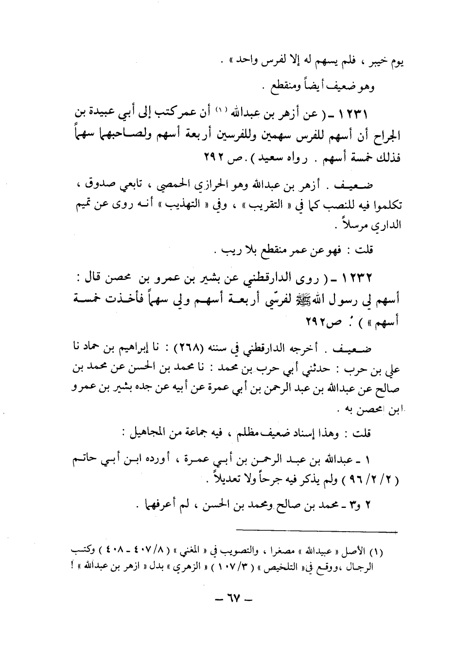 (1231) - (عن أزهر بن عبد الله (1) " أن عمر كتب إلى أبى عبيدة بن الجراح أن أسهم للفرس سهمين وللفرسين أربعة أسهم ولصاحبهما سهما فذلك خمسة أسهم " رواه سعيد (ص 292) .