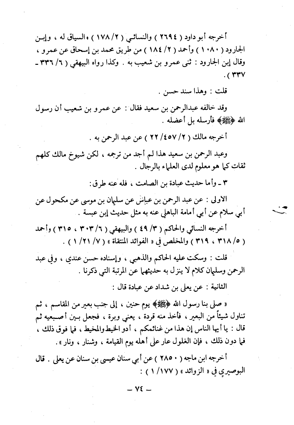 الثانية: عن يعلى بن شداد عن عبادة قال: " صلى بنا رسول الله صلى الله عليه وسلم يوم حنين , إلى جنب بعير من المقاسم , ثم تناول شيئا من البعير , فاخذ منه قردة , يعنى وبرة , فجعل بين أصبعه ثم قال: يا أيها الناس إن هذا من غنائمكم , أدوا الخيط والمخيط , فما فوق ذلك , فما دون ذلك , فإن الغلول عار على أهله يوم القيامة , وشنار , ونار ".