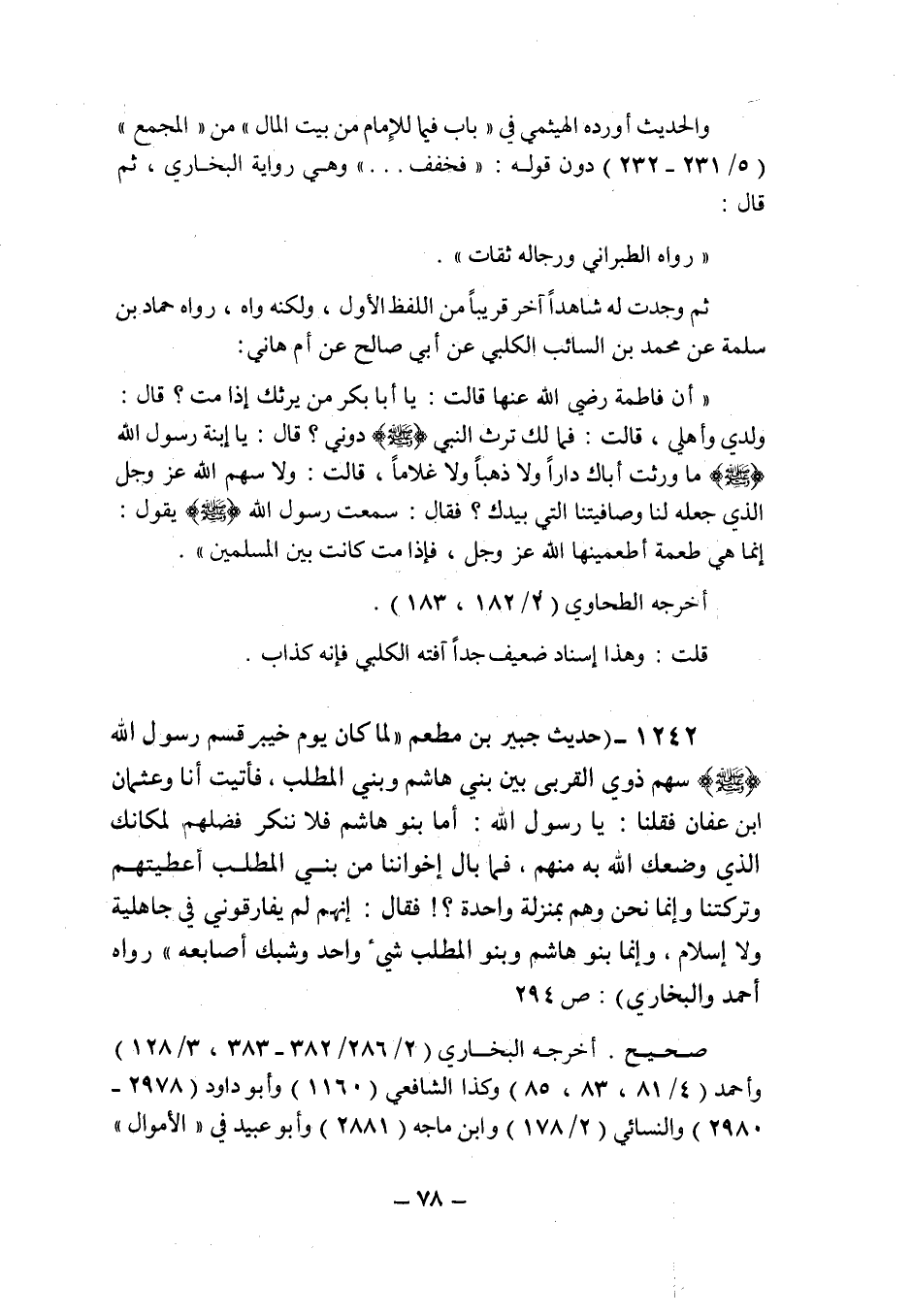 (1242) - (حديث جبير بن مطعم: " لما كان يوم خيبر قسم رسول الله صلى الله عليه وسلم سهم ذوى القربى بين بنى هشام وبنى المطلب , فأتيت أنا وعثمان ابن عفان فقلنا: يا رسول الله: أما بنو هاشم فلا ننكر فضلهم لمكانك الذى وضعك الله به منهم , فما بال إخواننا من بنى المطلب أعطيتهم وتركتنا وإنما نحن وهم بمنزلة واحدة؟ ! فقال: إنهم لم يفارقونى فى جاهلية ولا إسلام , وإنما بنو هاشم وبنو المطلب شىء واحد وشبك أصابعه " رواه أحمد والبخارى (ص 294) .