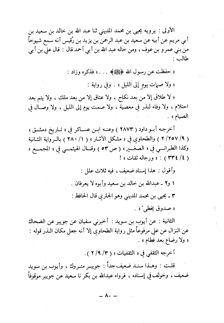 الثانية: عن أيوب بن سويد: أخبرنى سفيان عن جويبر عن الضحاك عن النزال عن على مرفوعا مثل رواية الطحاوى إلا أنه جعل مكان النذر قوله: " ولا رضاع بعد فطام ".
