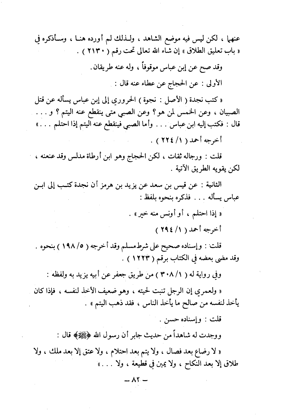 الأولى: عن الحجاج عن عطاء عنه قال: " كتب نجدة (الأصل: نجوة) الحرورى إلى ابن عباس يسأله عن قتل الصبيان , وعن الخمس لمن هو؟ وعن الصبى متى ينقطع عنه اليتم؟ و ... قال: فكتب إليه ابن عباس ... وأما الصبى فينقطع عنه اليتم إذا احتلم ... ".