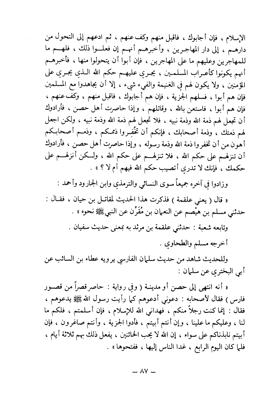 الإسلام , فإن أجابوك , فاقبل منهم وكف عنهم , ثم ادعهم إلى التحول من دارهم , إلى دار المهاجرين , وأخبرهم أنهم إن فعلوا ذلك , فلهم ما للمهاجرين وعليهم ما على المهاجرين , فإن أبوا أن يتحولوا منها , فأخبرهم أنهم يكونوا كأعراب المسلمين , يجرى عليهم حكم الله الذى يجرى على المؤمنين , ولا يكون لهم فى الغنيمة والفىء شىء إلا أن يجاهدوا مع المسلمين فإن هم أبوا , فسلهم الجزية , فإن هم أجابوك , فاقبل منهم , وكف عنهم , فإن هم أبوا فاستعن بالله , وقاتلهم , وإذا حاصرت أهل حصن , فأرادوك أن تجعل لهم ذمة الله وذمة نبيه , فلا تجعل لهم ذمة الله وذمة نبيه , ولكن اجعل لهم ذمتك وذمة أصحابك , فإنكم أن تخفروا ذممكم وذمم أصحابكم أهون من أن تخفروا ذمة الله وذمة رسوله , وإذا حاصرت أهل حصن , فأرادوك أن تنزلهم على حكم الله , فلا تنزلهم على حكم الله , ولكن أنزلهم على حكمك , فإنك لا تدرى أتصيب حكم الله فيهم أم لا؟ ".