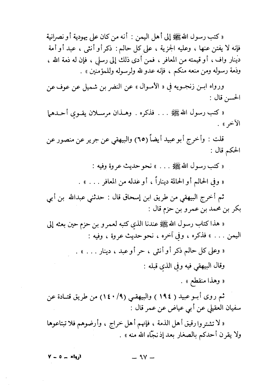 قلت: وأخرج أبو عبيد أيضا (65) والبيهقى عن جرير عن منصور عن الحكم قال: " كتب رسول الله صلى الله عليه وسلم ... " نحو حديث عروة وفيه: " وفى الحالم أو الحالمة دينارا , أو عدله من المعافر ... ".