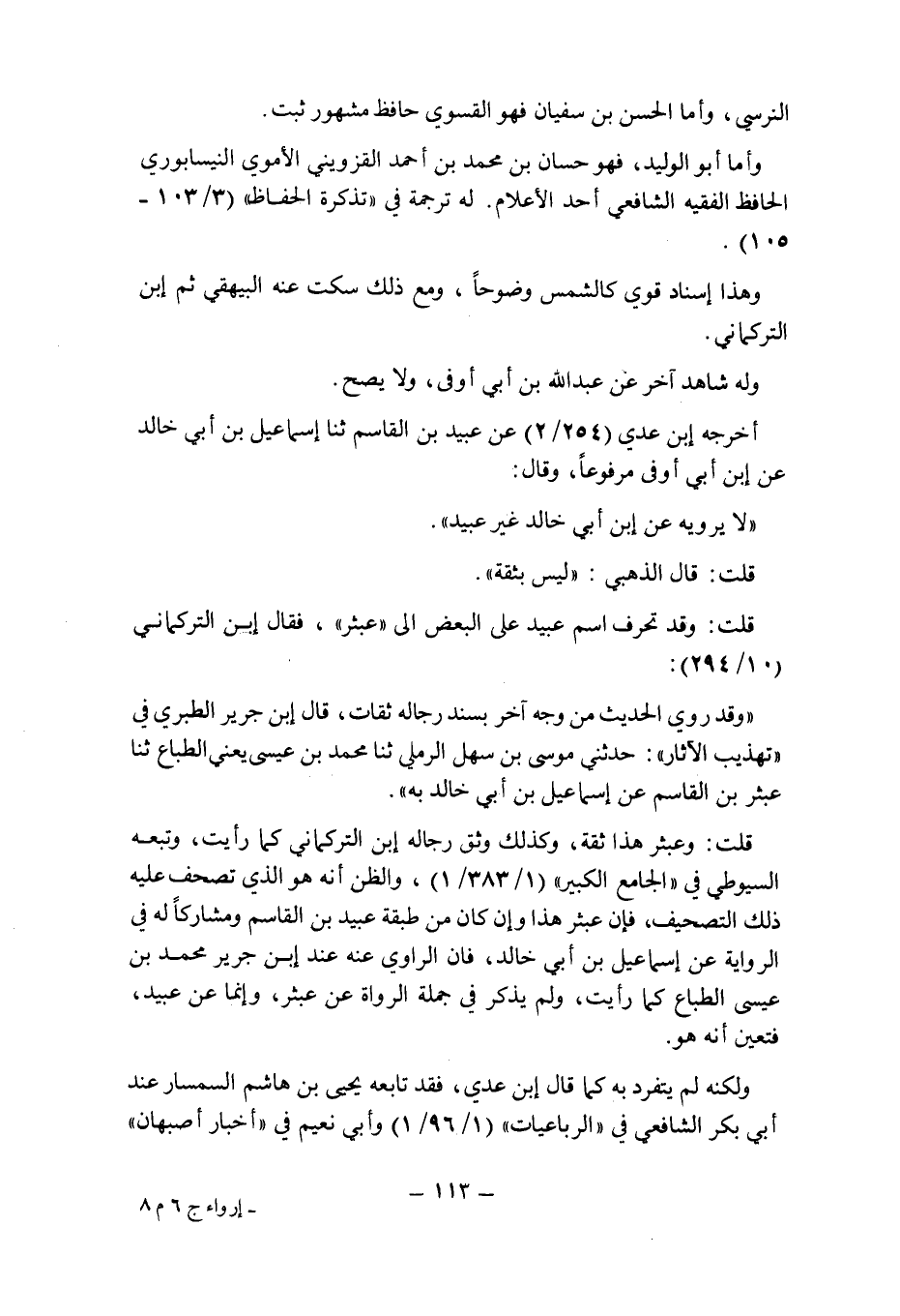 قلت: وقد تحرف اسم عبيد على البعض إلى " عبثر " , فقال ابن التركمانى (10/294) : " وقد روى الحديث من وجه آخر بسند رجاله ثقات , قال ابن جرير الطبرى فى " تهذيب الآثار ": حدثنى موسى بن سهل الرملى حدثنا محمد بن عيسى يعنى الطباع حدثنا عبثر بن القاسم عن إسماعيل بن أبى خالد به ".