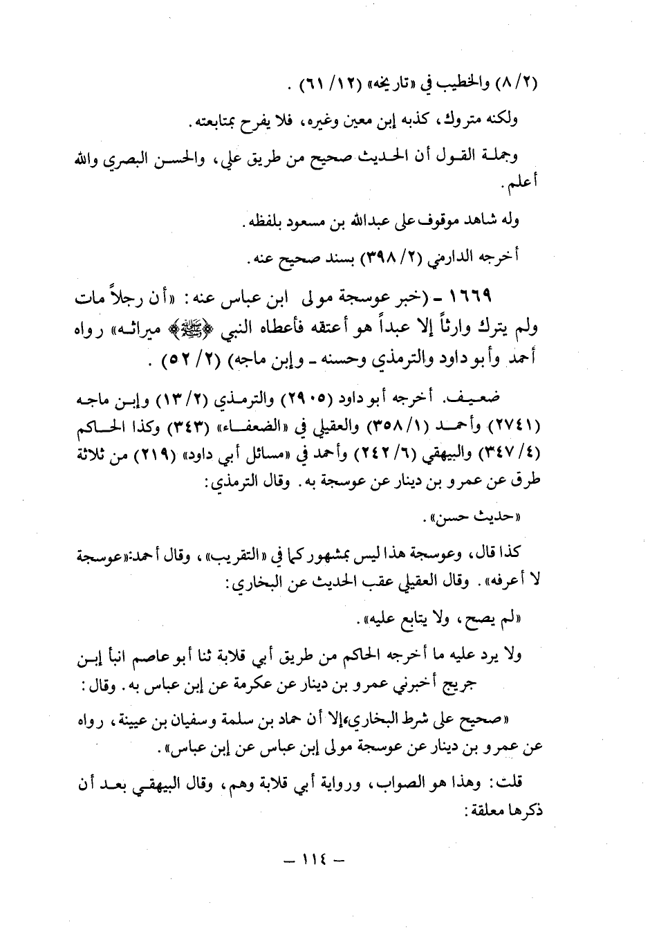 (1669) - (خبر عوسجة مولى ابن عباس عنه: " أن رجلا مات ولم يترك وارثا إلا عبدا هو أعتقه فأعطاه النبى صلى الله عليه وسلم ميراثه " رواه أحمد وأبو داود والترمذى ـ وحسنه ـ وابن ماجه (2/52) .