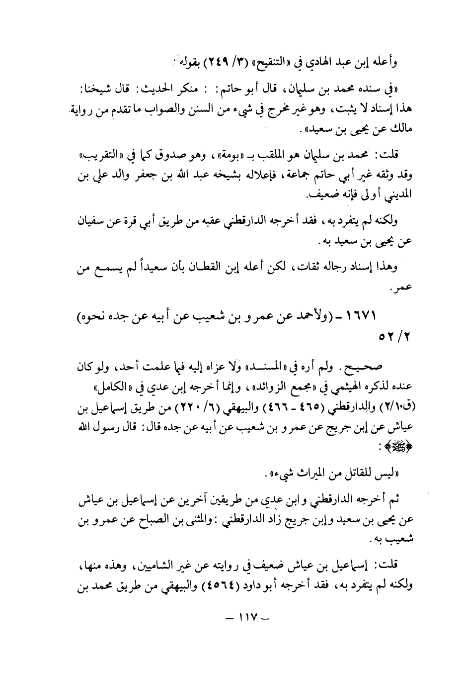 وأعله ابن عبد الهادى فى " التنقيح " (3/249) بقوله: " فى سنده محمد بن سليمان , قال أبو حاتم: منكر الحديث: قال شيخنا: هذا إسناد لا يثبت , وهو غير مخرج فى شىء من السنن والصواب ما تقدم من رواية مالك عن يحيى بن سعيد ".