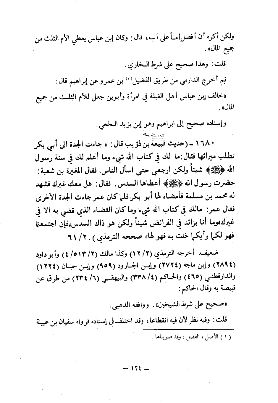 (1680) - (حديث (قبيعة) [1] بن ذؤيب قال: " جاءت الجدة إلى أبى بكر تطلب ميراثها فقال: ما لك فى كتاب الله شىء وما أعلم لك فى سنة رسول الله صلى الله عليه وسلم شيئا ولكن ارجعى حتى أسأل الناس فقال المغيرة بن شعبة: حضرت رسول الله صلى الله عليه وسلم أعطاها السدس. فقال: هل معك غيرك فشهد له محمد بن مسلمة فأمضاه لها أبو بكر , فلما كان عمر جاءت الجدة الأخرى فقال عمر: ما لك فى كتاب الله شىء وما كان القضاء الذى قضى به إلا فى غيرك , وما أنا بزائد فى الفرائض شيئا ولكن هو ذاك السدس , فإن اجتمعتما فهو لكما وأيكما خلت به فهو لها " صححه الترمذى (2/61) .