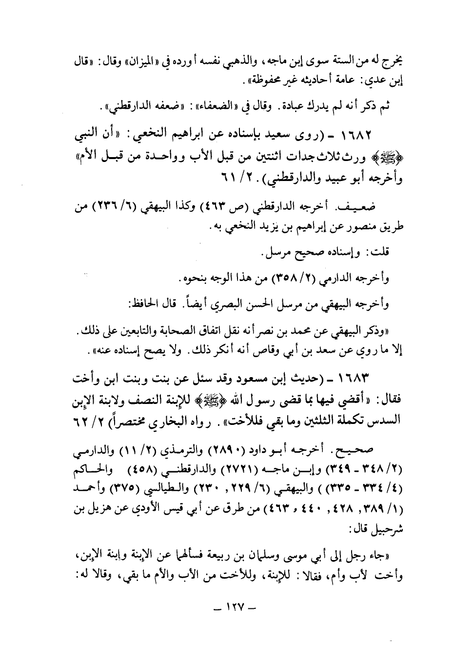 (1682) - (روى سعيد بإسناده عن إبراهيم النخعى: " أن النبى صلى الله عليه وسلم ورث ثلاث جدات اثنتين من قبل الأب وواحدة من قبل الأم " وأخرجه أبو عبيد والدارقطنى (2/61) .