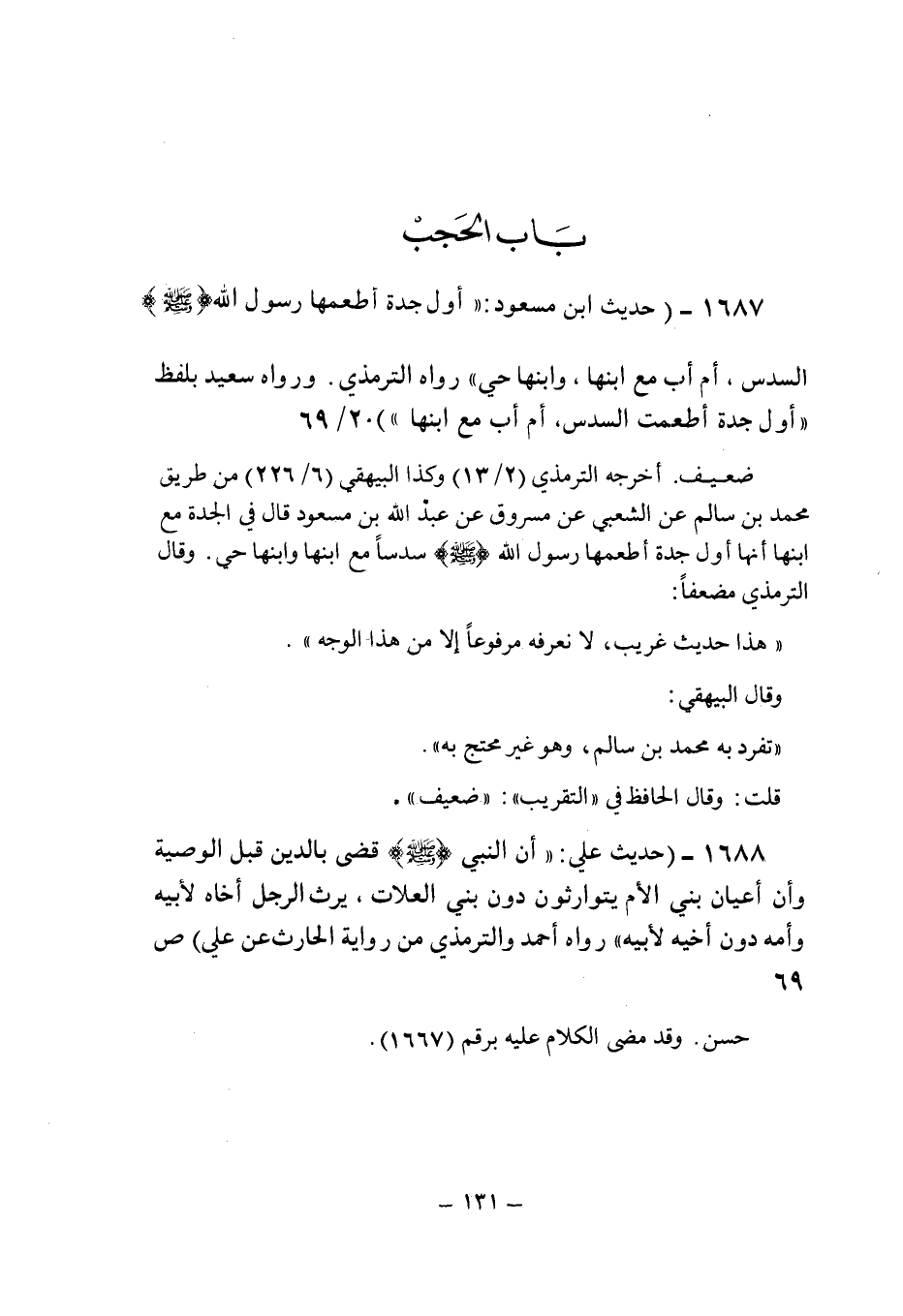 (1687) - (حديث ابن مسعود: " أول جدة أطعمها رسول الله صلى الله عليه وسلم السدس , أم أب مع ابنها , وابنها حى " رواه الترمذى. ورواه سعيد بلفظ: " أول جدة أطعمت السدس , أم أب مع ابنها " (2/69) .