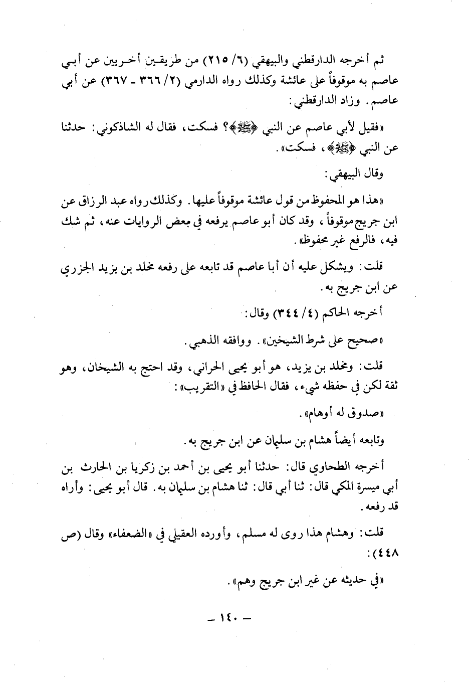 وزاد الدارقطنى: " فقيل لأبى عاصم عن النبى صلى الله عليه وسلم؟ فسكت , فقال له الشاذكونى: حدثنا عن النبى صلى الله عليه وسلم , فسكت ".