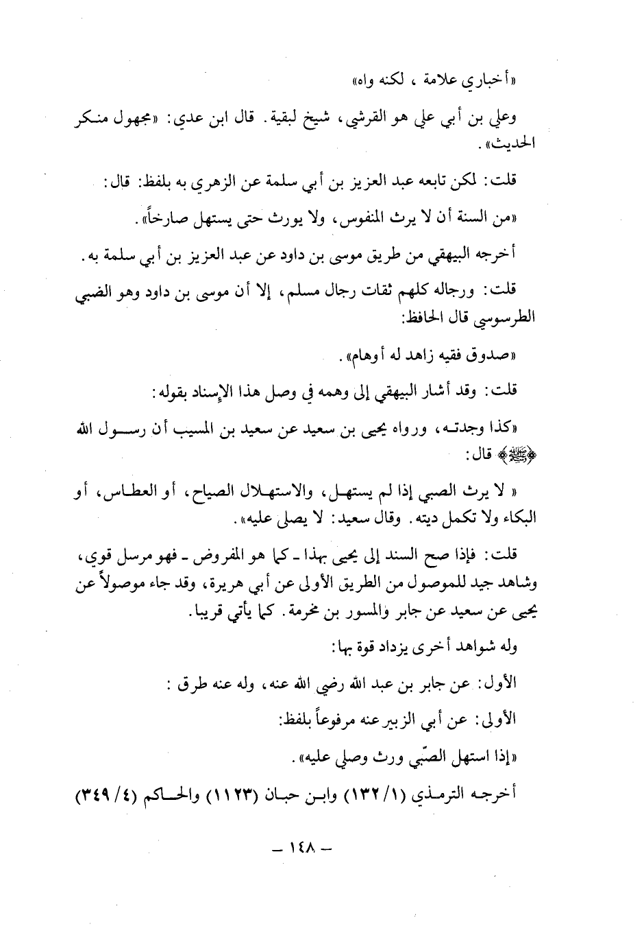 قلت: وقد أشار البيهقى إلى وهمه فى وصل هذا الإسناد بقوله: " كذا وجدته , ورواه يحيى بن سعيد عن سعيد بن المسيب أن رسول الله صلى الله عليه وسلم قال: " لا يرث الصبى إذا لم يستهل , والاستهلال الصياح , أو العطاس , أو البكاء ولا تكمل ديته , وقال سعيد: لا يصلى عليه ".