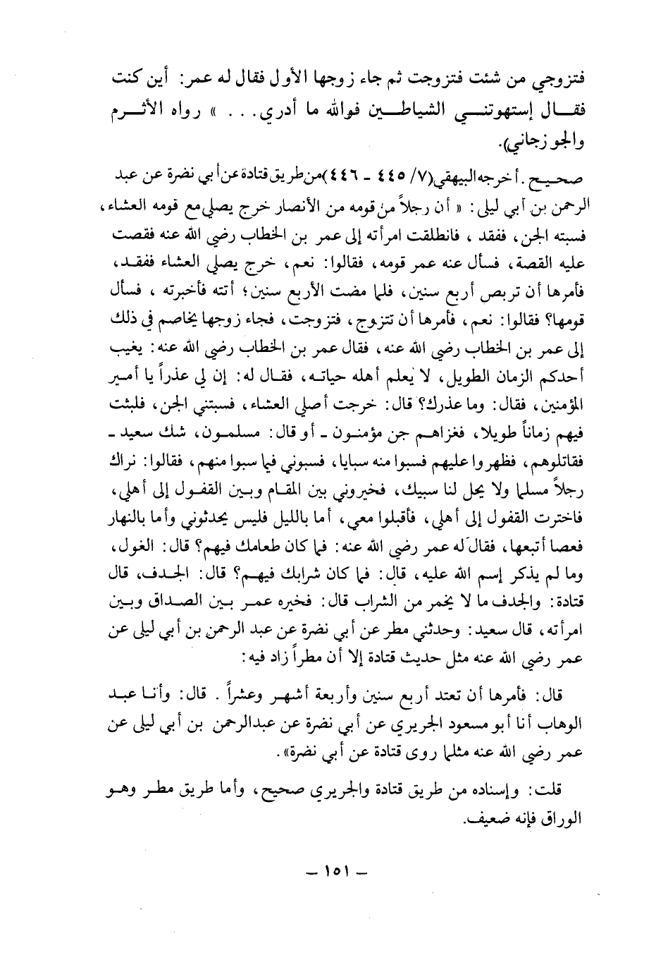 أخرجه البيهقى (7/445 ـ 446) من طريق قتادة عن أبى نضرة عن عبد الرحمن بن أبى ليلى: " أن رجلا من قومه من الأنصار خرج يصلى مع قومه العشاء , فسبته الجن , ففقد , فانطلقت امرأته إلى عمر بن الخطاب رضى الله عنه فقصت عليه القصة , فسأل عنه عمر قومه , فقالوا: نعم , خرج يصلى العشاء ففقد , فأمرها أن تربص أربع سنين , فلما مضت الأربع سنين , أتته فأخبرته , فسأل قومها؟ فقالوا: نعم , فأمرها أن تتزوج , فتزوجت , فجاء زوجها يخاصم فى ذلك إلى عمر بن الخطاب رضى الله عنه , فقال عمر بن الخطاب رضى الله عنه: يغيب أحدكم الزمان الطويل , لا يعلم أهله حياته , فقال له: إن لى عذرا يا أمير المؤمنين , فقال: وماعذرك؟ قال: خرجت أصلى العشاء , فسبتنى الجن , فلبثت فيهم زمانا طويلا , فغزاهم جن مؤمنون ـ أو قال: مسلمون , شك سعيد ـ فقاتلوهم , فظهروا عليهم فسبوا منه سبايا , فسبونى فيما سبوا منهم , فقالوا: نراك رجلا مسلما ولا يحل لنا سبيك , فخيرونى بين المقام وبين القفول إلى أهلى , فاخترت القفول إلى أهلى , فأقبلوا معى , أما بالليل فليس يحدثونى وأما بالنهار فعصا أتبعها , فقال له عمر رضى الله عنه: فما كان طعامك فيهم؟ قال: الغول , وما لم يذكر اسم الله عليه قال: فما كان شرابك فيهم؟ قال: الجدف , قال قتادة: والجدف ما لايخمر من الشراب قال: فخيره عمر بين الصداق وبين امرأته , قال سعيد وحدثنى مطر عن أبى نضرة عن عبد الرحمن بن أبى ليلى عن عمر رضى الله عنه مثل حديث قتادة إلا أن مطرا زاد فيه: قال: فأمرها أن تعتد أربع سنين وأربعة أشهر وعشرا.