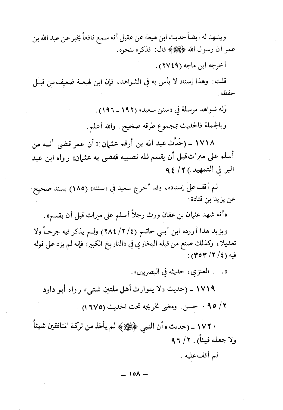 (1718) - (حدَّثَ عبد الله بن أرقم عثمان: " أن عمر قضى أنه من أسلم على ميراث قبل أن يقسم فله نصيبه فقضى به عثمان ". رواه ابن عبد البر فى التمهيد (2/94) .